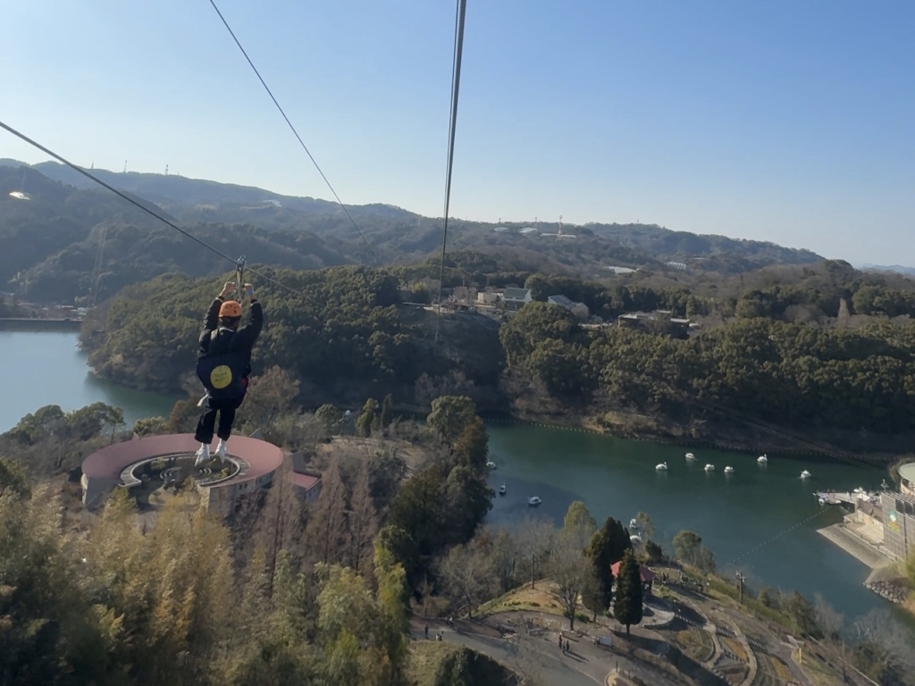 とべ動物園とえひめこどもの城を結ぶとべもりジップラインは、滑りながらの爽快感楽しい人気アクティビティです。