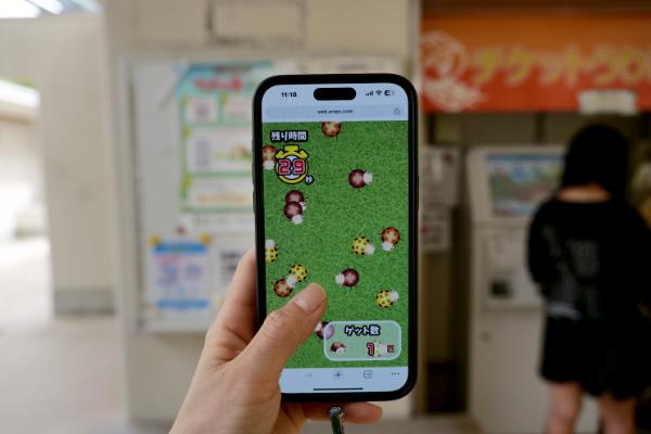 ジップラインに乗るコシロちゃんを右・左・真ん中と動かして、愛媛の特産品をゲットしながらポイントを稼ぎます!