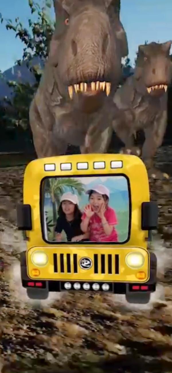 『恐竜出没注意』と書かれたステッカーの上に立ち、ニコニコしている子どもたちの横では恐竜が大暴れ!