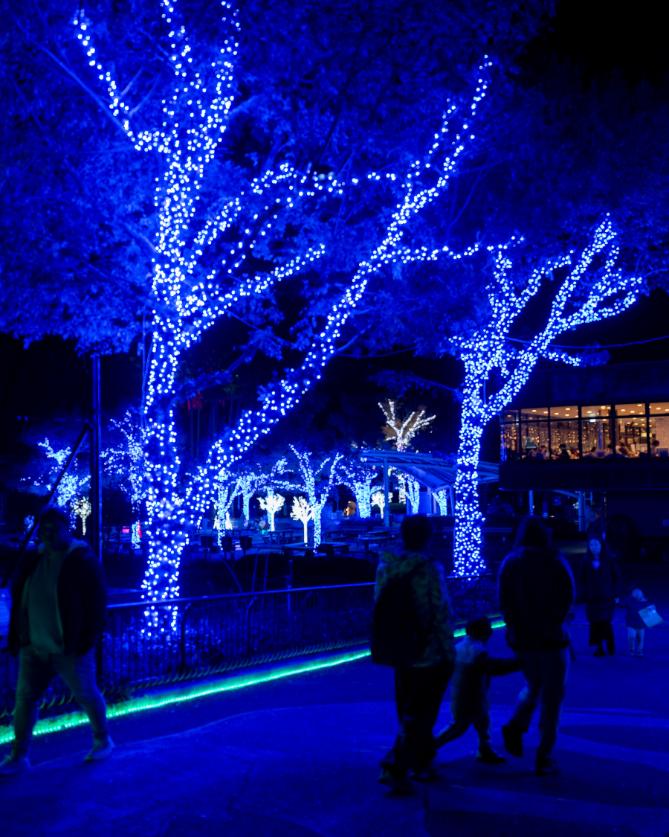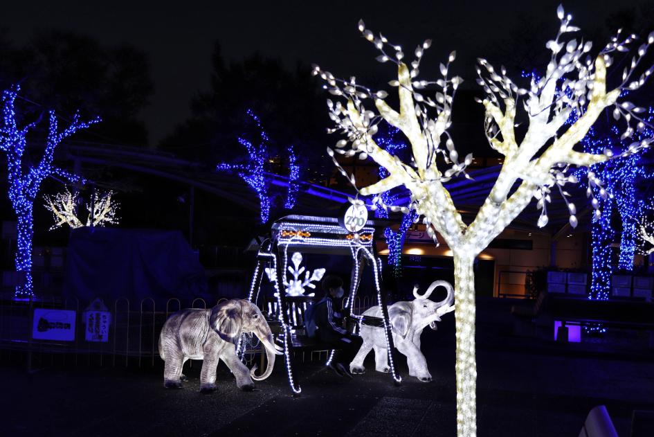青く輝くイルミネーションの中を歩く来園者の姿が印象的。夜の動物園の雰囲気を感じられる作品です。
