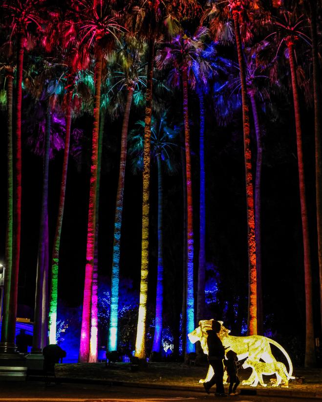 カラフルにライトアップされたヤシの木と、ライオンのオブジェの前を歩く親子のシルエット。夜のとべ動物園ならではの幻想的な雰囲気が印象的な一枚です。