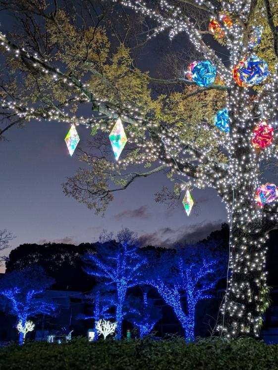 きらめくイルミネーションと宝石のようなオーナメントが夜空に映える一枚。幻想的な園内の景色が美しく切り取られています。