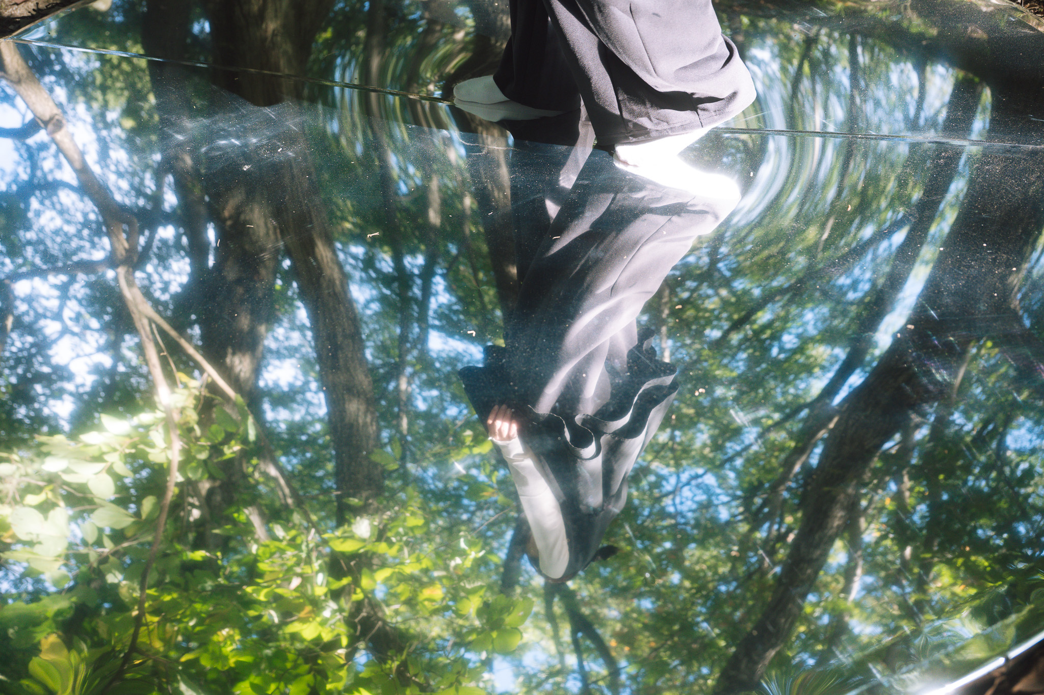 空や木々、人々が映り込み、ゆらめく光がまるで「水の上を歩く」ような感覚を呼び起こします。