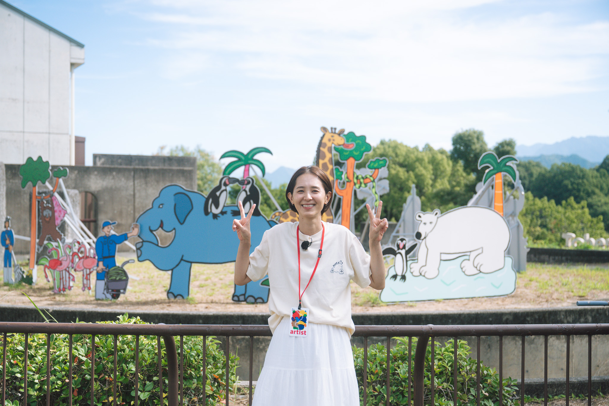 イラストレーター・八木亜希紗さん(上の写真)によるパネルアートは、動物園で働く飼育員さんたちも登場する温かな世界観。