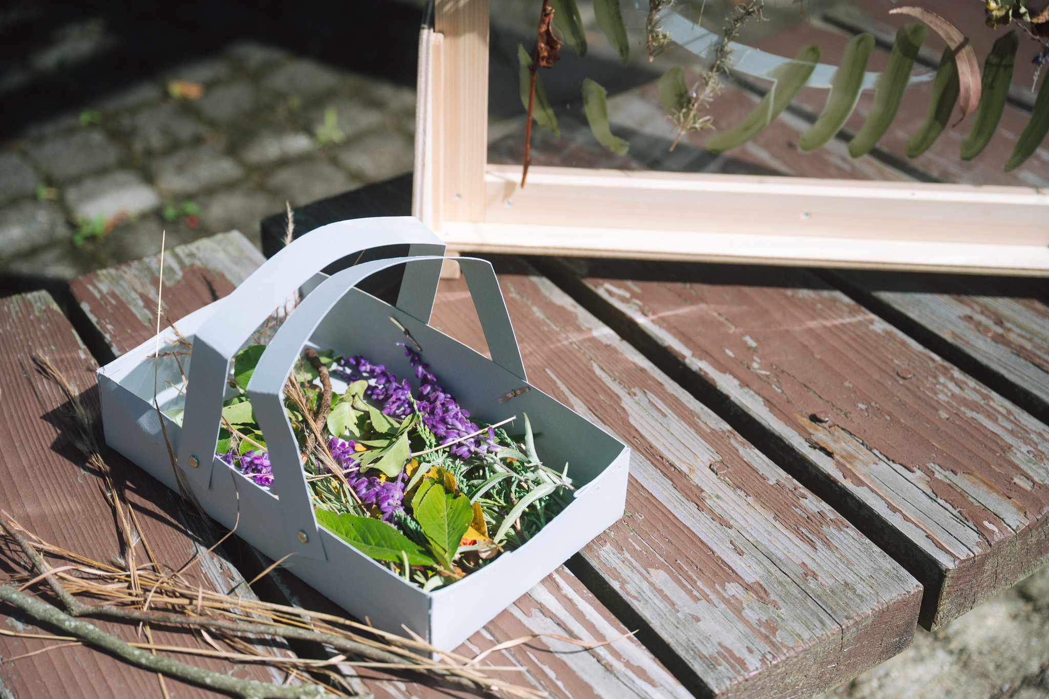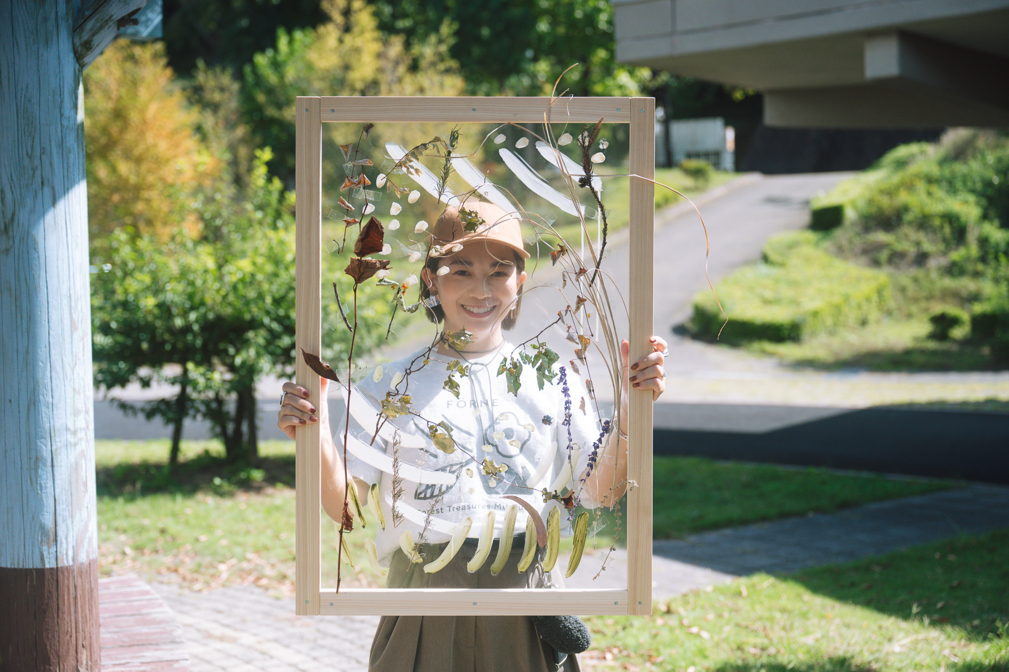 透明なアートフレームに、自然の中で見つけた花や木の枝、葉っぱを自由に表現する共創型アート体験。