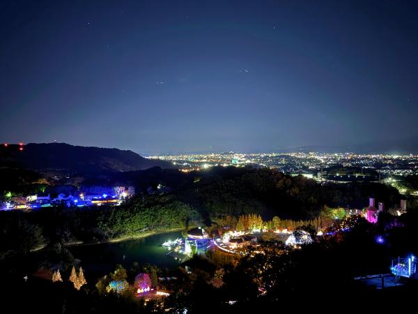 『てっぺんとりで』の展望台から見下ろす、えひめこどもの城のイルミネーションと松山平野の夜景は最高!