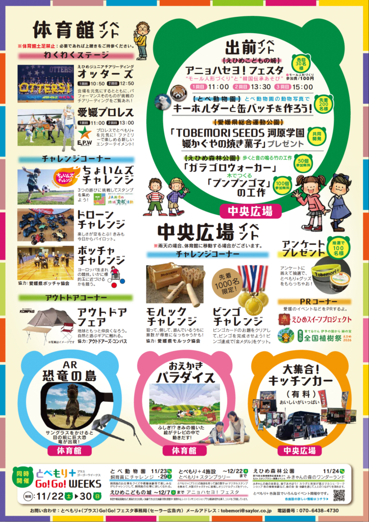 とべもり+(プラス)4施設の出張体験イベントに加えて、ステージイベント、チャレンジコーナー、アウトドアコーナー、AR(拡張現実)、おえかきパラダイスなどチャレンジしながら遊んで学べるプログラムを多数ご用意しています。